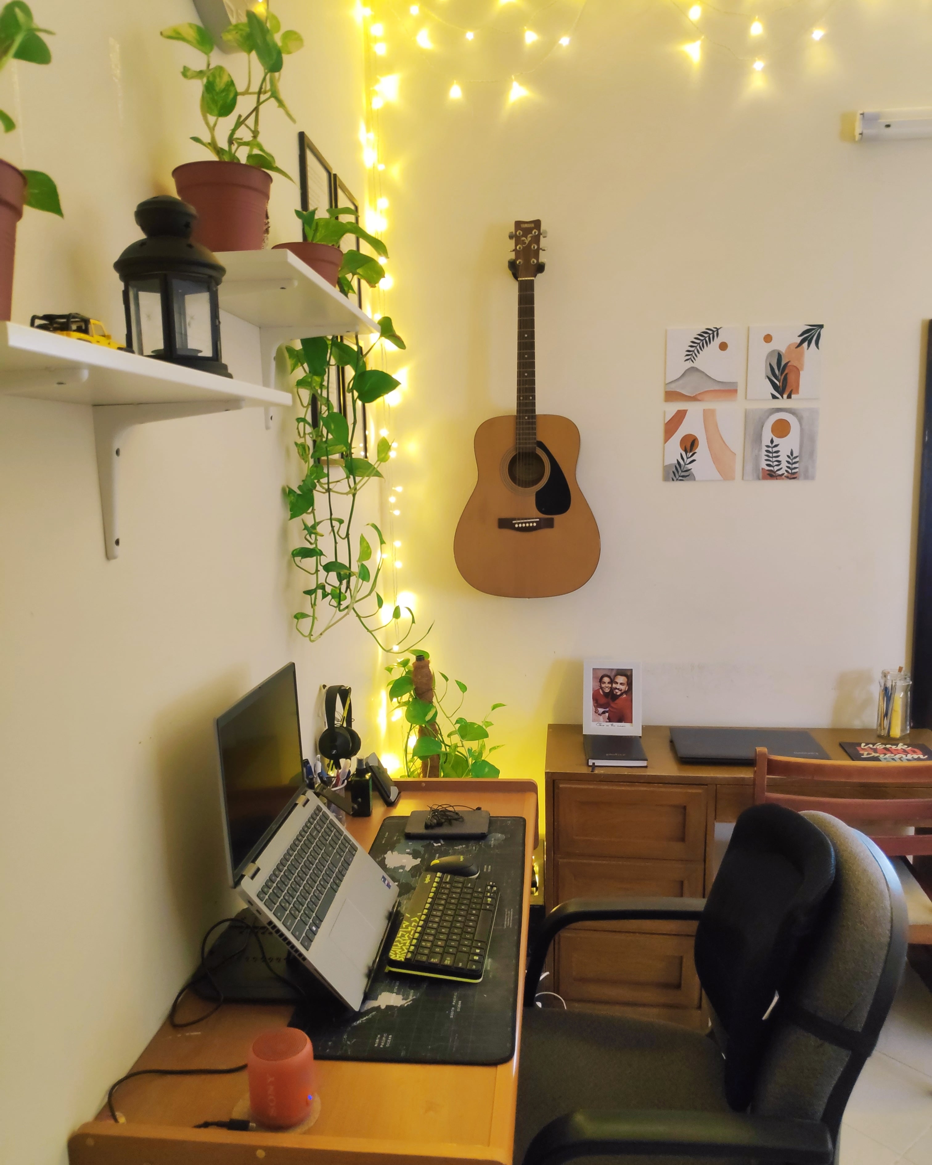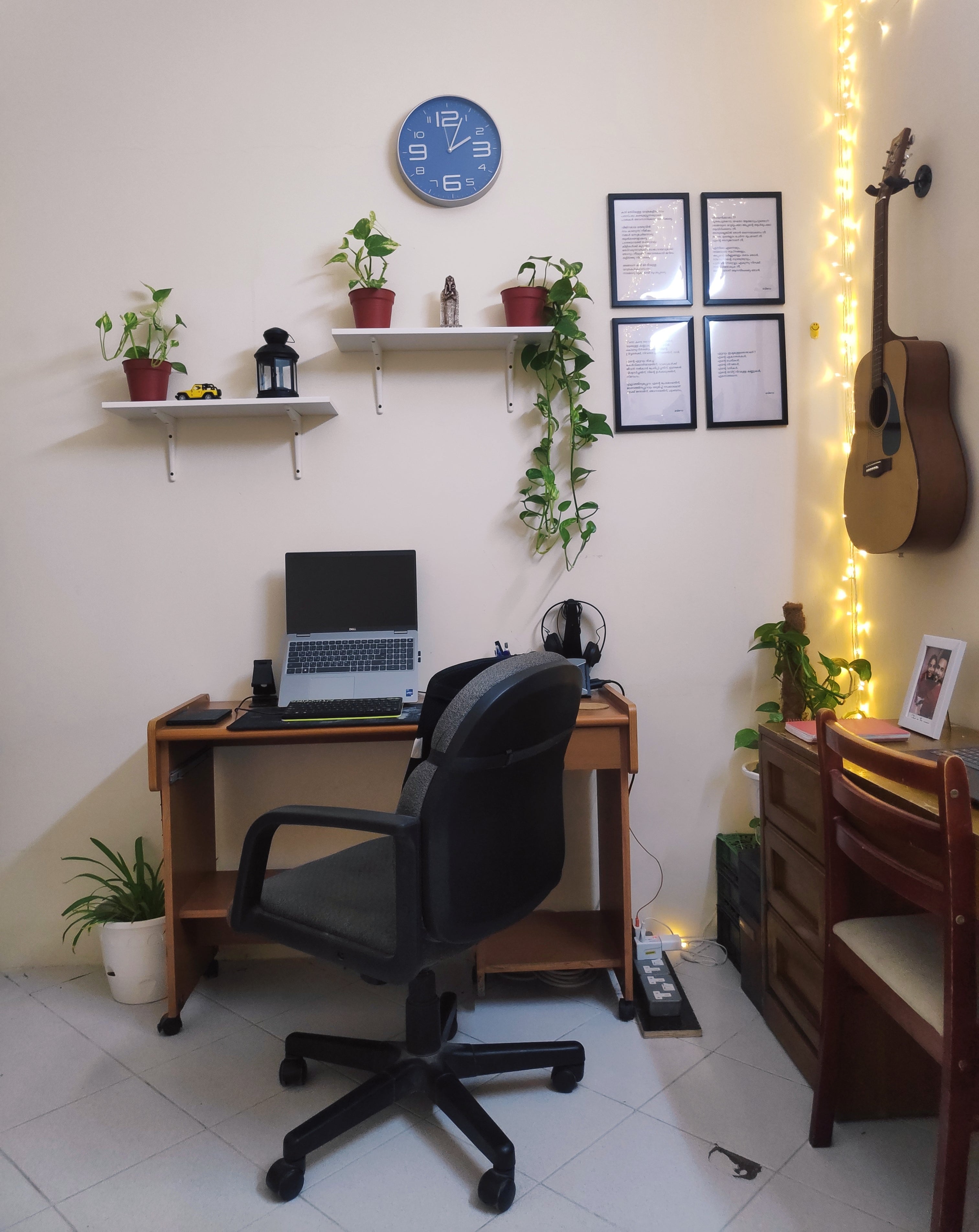 To create a workspace that was both functional and beautiful, I added a few personal touches that were meaningful to me. Besides coding, I love plants, writing random thoughts, and traveling to new places. To reflect these, I placed money plants in the wooden shelves, framed poems that I wrote, and a mouse pad with a world map remainds me ’the world is wide, life is short’. Also, I am planning to add some posters with my favourite quotes.